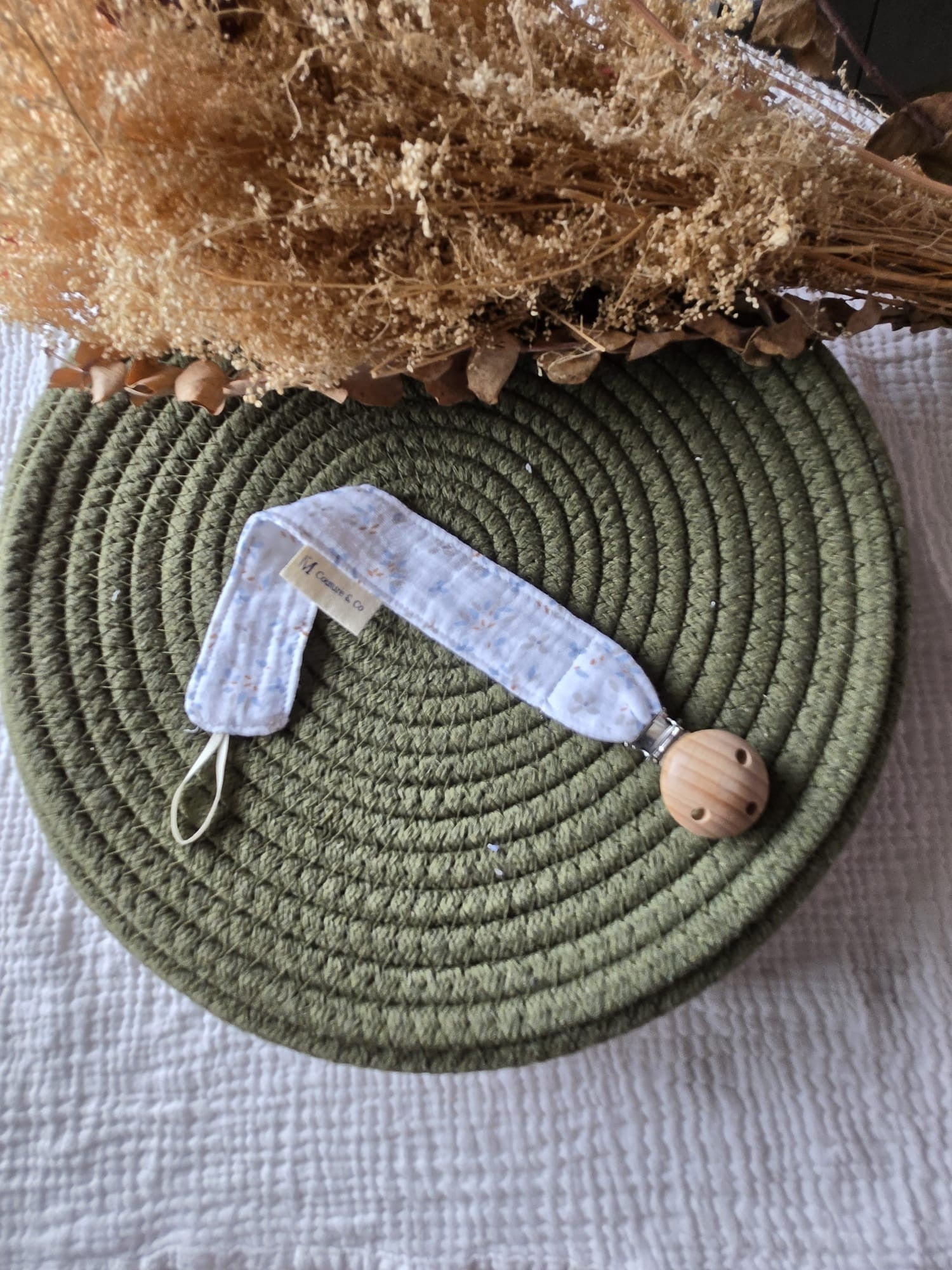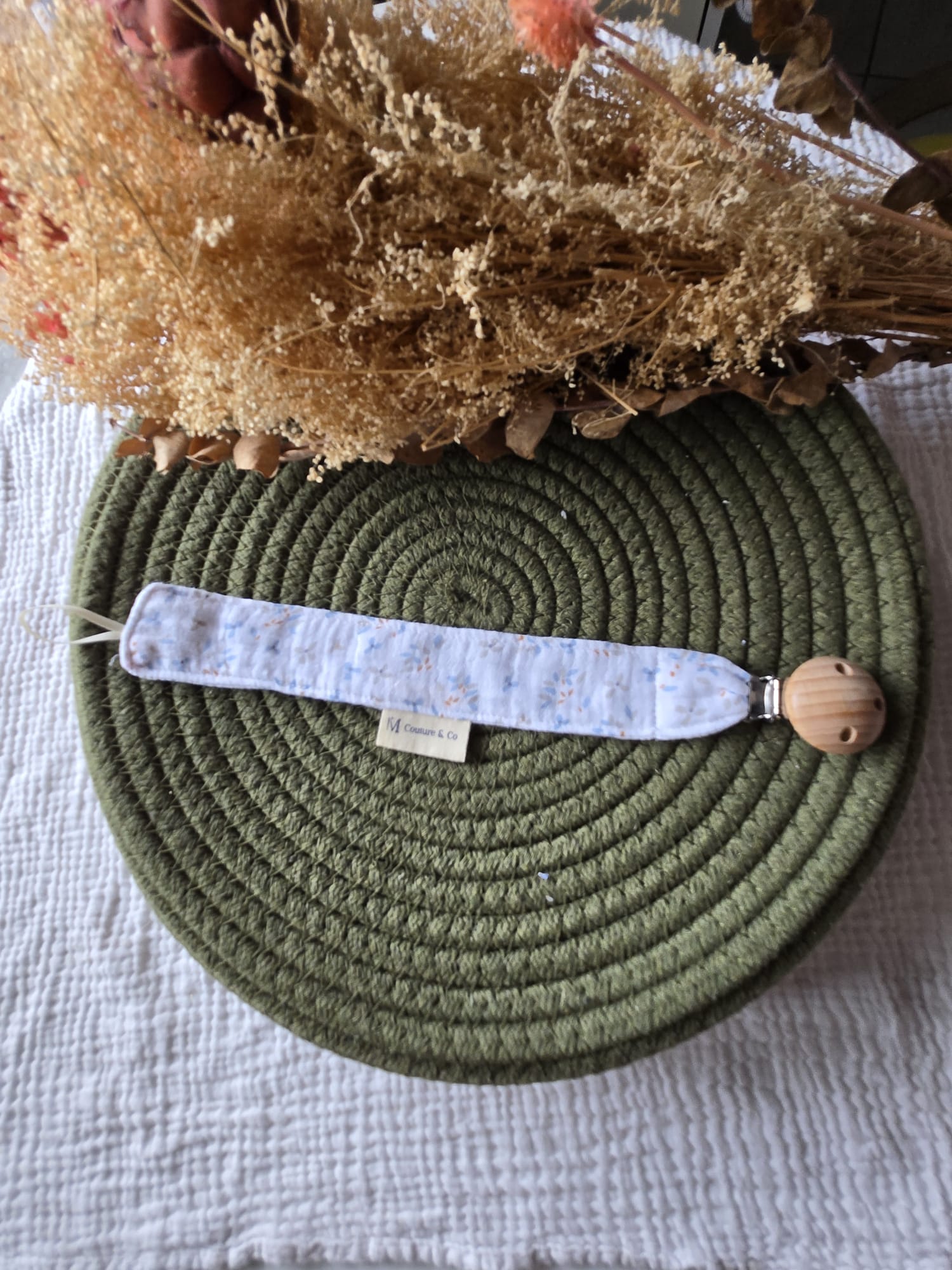 Confectionnée avec soin, elle se clipse facilement aux vêtements, au bavoir ou même au doudou, pour rester toujours à proximité.