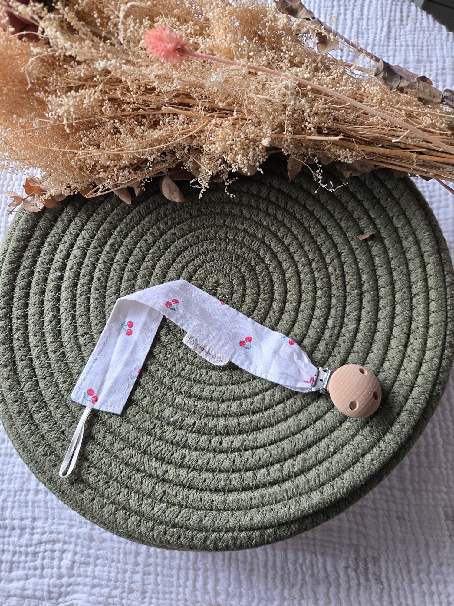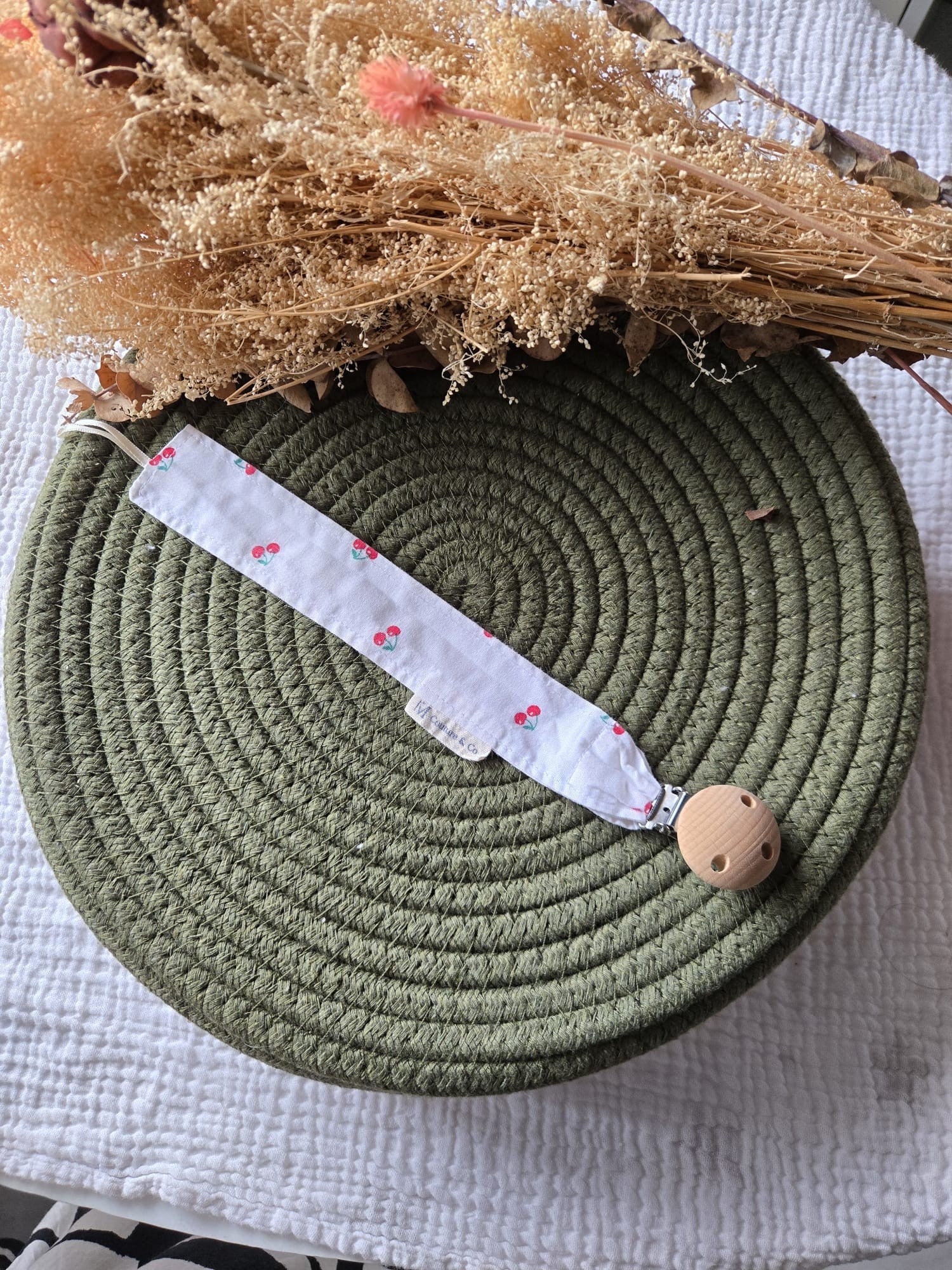 Confectionnée avec soin, elle se clipse facilement aux vêtements, au bavoir ou même au doudou, pour rester toujours à proximité.