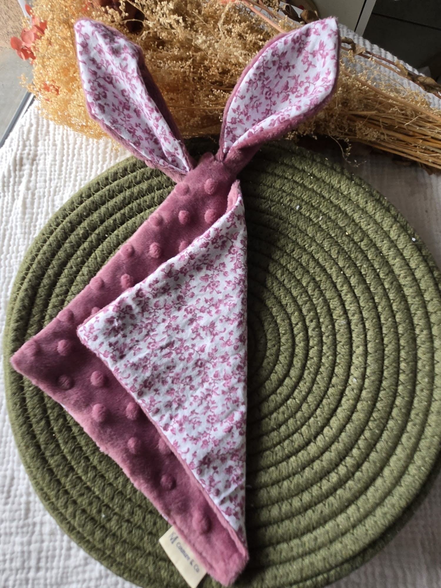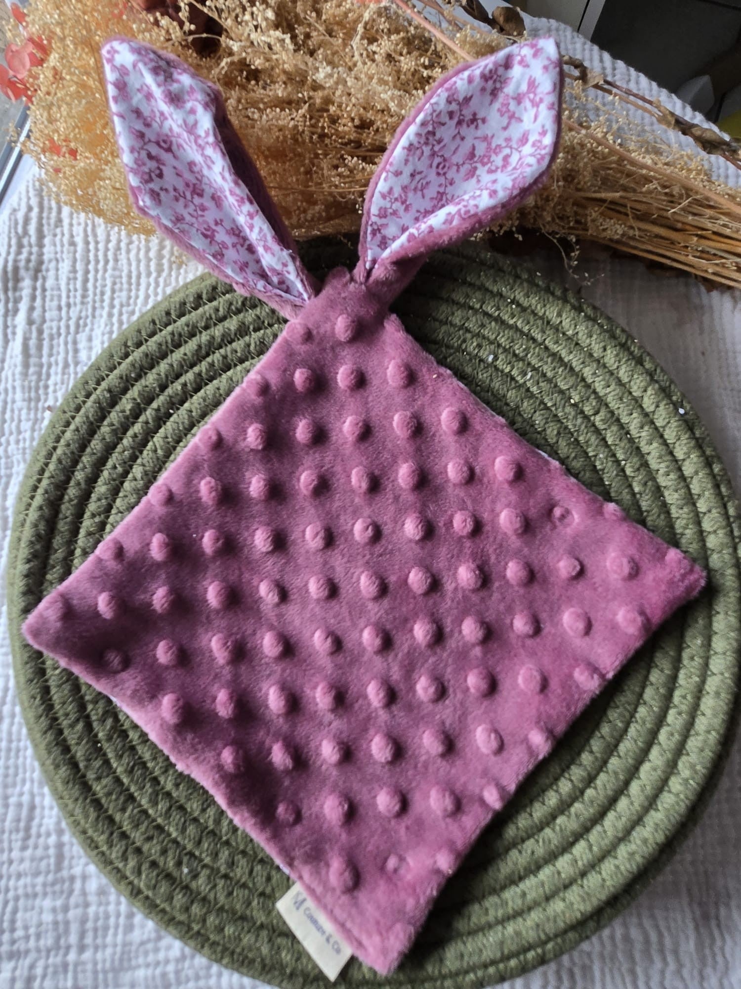 Tout en tendresse, ce joli doudou carré aux oreilles de lapin a été entièrement cousu main, avec amour et soin. Son tissu minky sensoriel tout doux invite au réconfort, pour accompagner bébé à chaque moment.