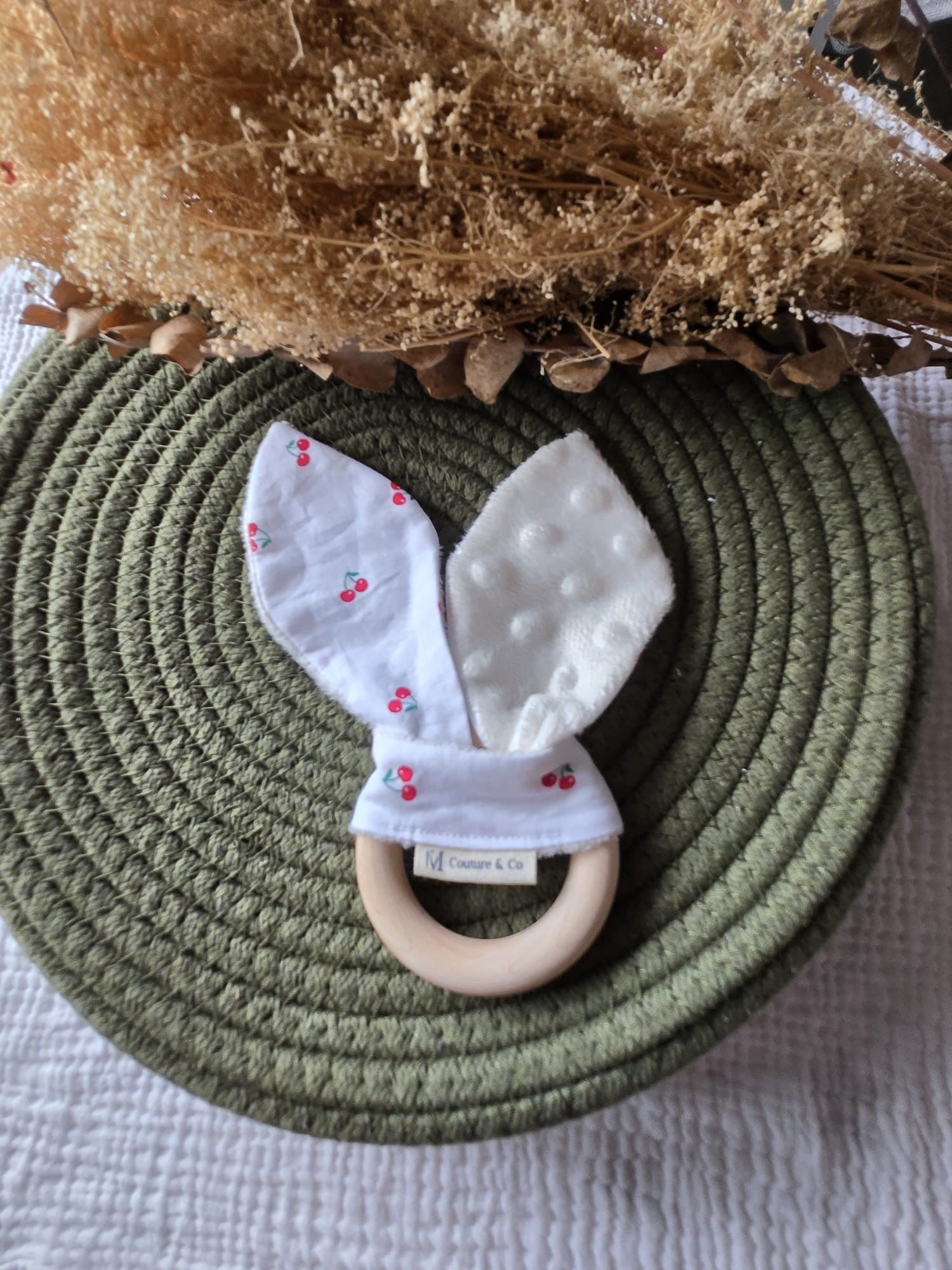Composition : anneau est en bois de hêtre naturel, non traité et sans produits chimiques, certifié CE. Tissus coton et minky certifié oeko-tex.